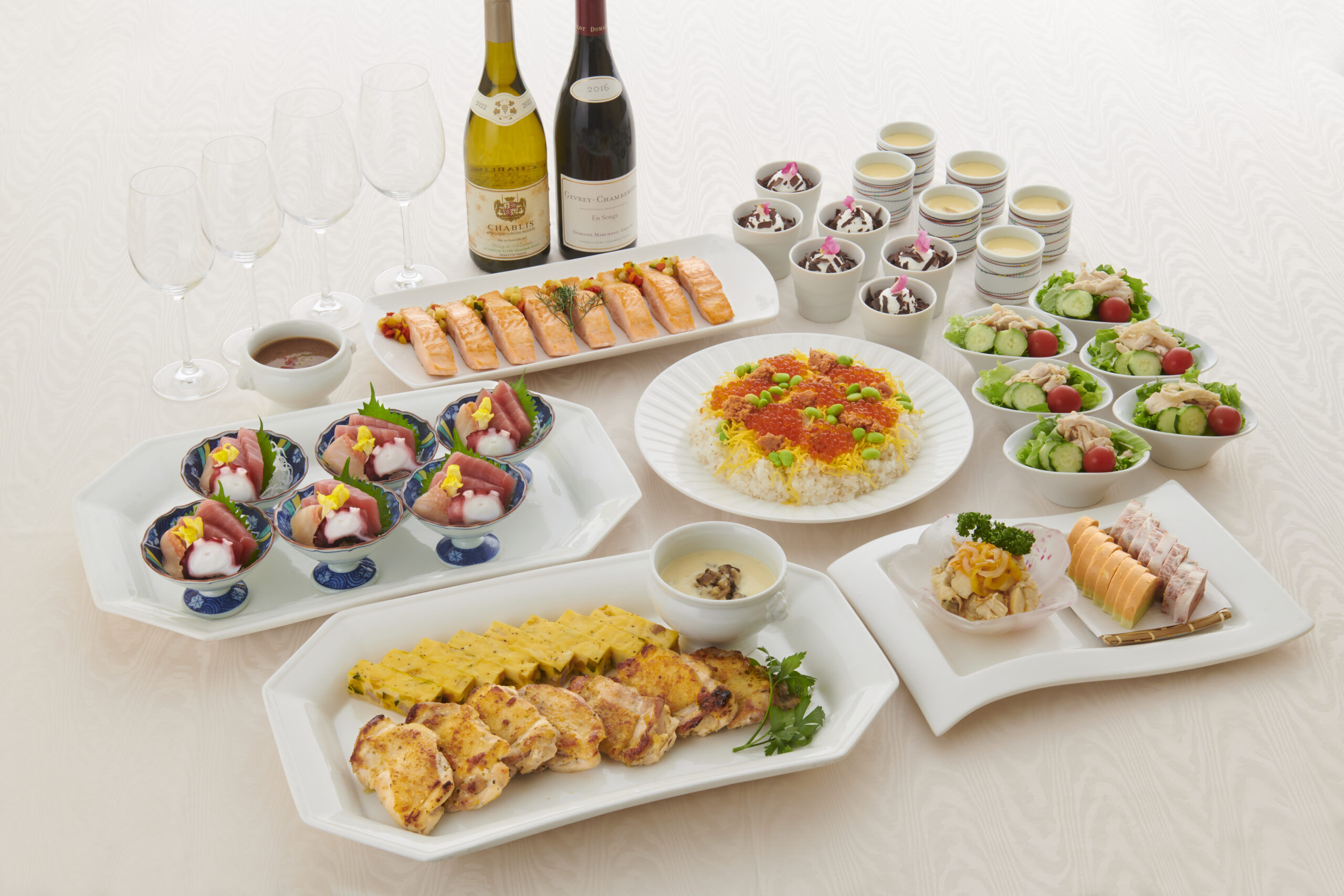 | (B) お1人様:6,750円 | ■和洋創作料理 8品■ ・旬菜3点盛り合わせ ・あさりと春キャベツの和風玉子とじスープ ・お造り3点盛り ・フレッシュサラダ ・アトランティックサーモンオーブン焼き ・味わい鶏のロースト マスタードデミグラスソース ・竹の子御飯 ・桜のブランマンジェ ■中国料理 8品■ ・前菜3種盛り合わせ ・海老蒸し餃子 ・ミニ春巻き ・豚肉と季節野菜のブラックビーンズ炒め ・海老のチリソース ・白身魚のフリッター 香味ソース添え ・五目炒飯 ・杏仁豆腐 |